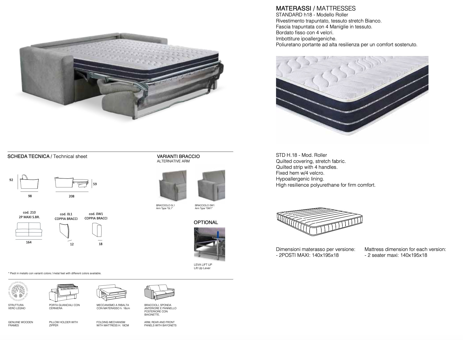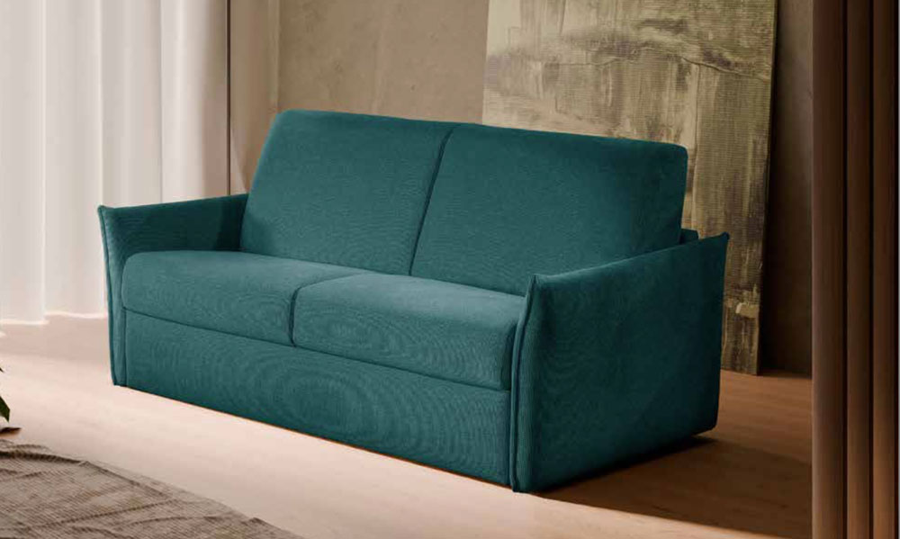 Divano letto modello Sole disponibile da cm 186 e da cm 196 , materasso 140*195h18 con vano porta guanciali.