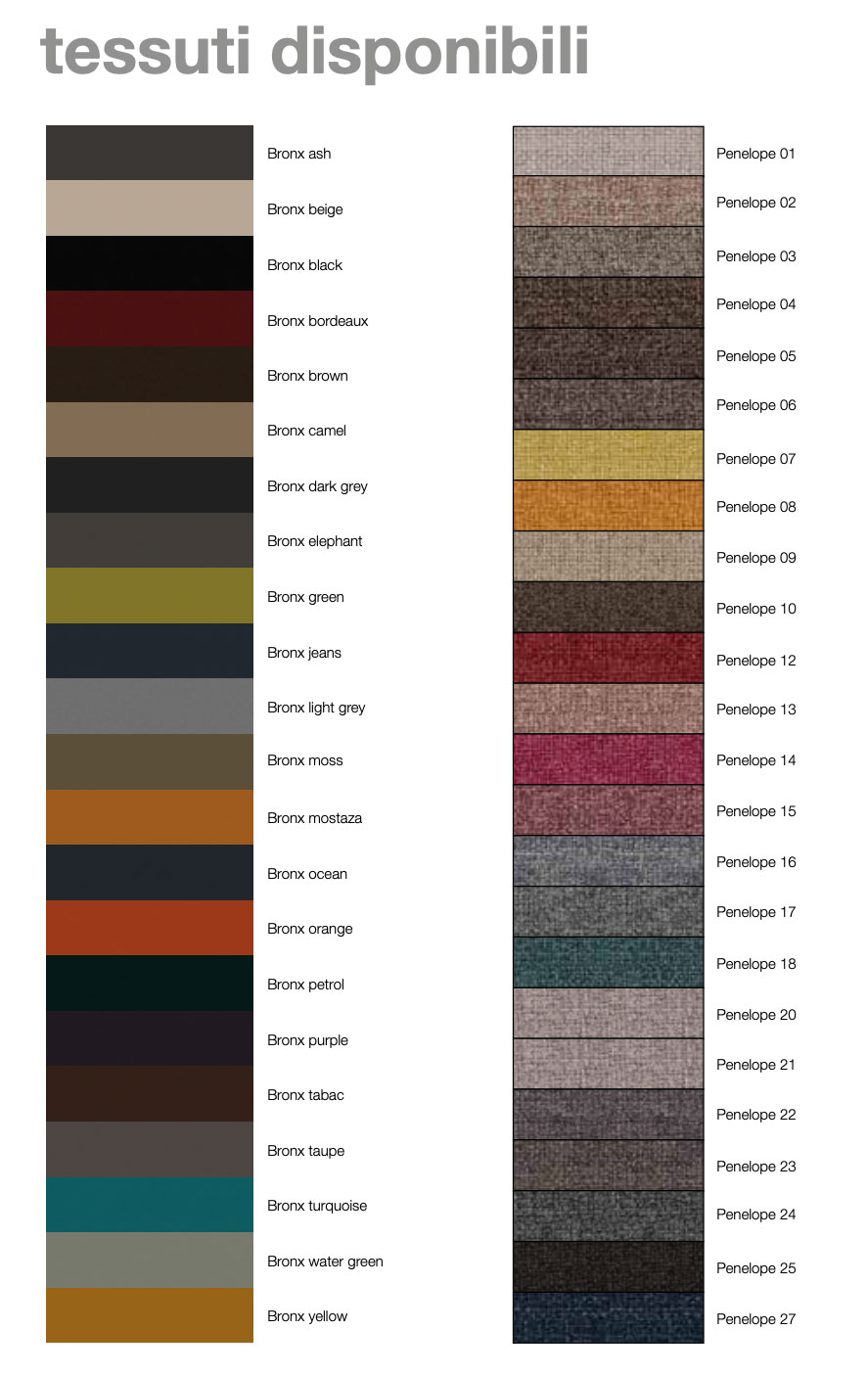 tessuti in fibra naturale (lino, cotone, viscosa), tessuti in fibra di poliestere (antimacchia e idrorepellenti ), ecopelle e vera pelle.